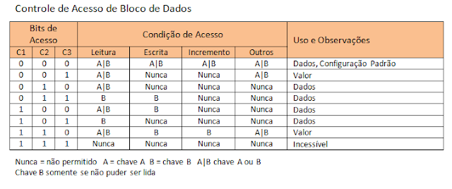 No cartão de 1K cada uma das partes controla diretamente o acesso a um bloco (reparar que estamos, inclusive, controlando o acesso ao bloco que controla o acesso). Os três bits de cada parte definem qual chave é necessária para leitura e escrita e são interpretados de forma diferente para os blocos de dados e o bloco de configuração: